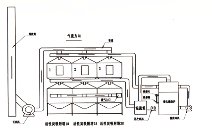 吸附器的作用是吸附凈化氣體中的有機(jī)物質(zhì),氣體通過吸附器后,氣體中的有機(jī)物質(zhì)被活性炭吸附而截留,氣體得到凈化。本系統(tǒng)中的吸附器有3-7臺(tái),每臺(tái)的設(shè)計(jì)處理風(fēng)量為2500-15000m3/h,